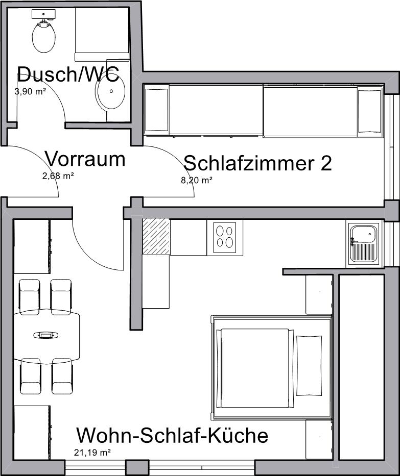 Hoch oben im 2.OG, mit herrlicher Aussicht über das ganze Tal, zum Skilift und in den Ort hinüber (Süd-Balkon!!), befindet sich die "Studiowohnung" für bis zu 4 Personen. Im Hauptraum ist ein Doppelbett, eine vollwertige Küchenzeile (2 Herdplatten, Backrohr, Kühlschrank, Geschirrspüler, Kaffeemaschine, Wasserkocher, Toaster, Dunstabzug) sowie ein Essplatz und 2 Kästen. Auch ein Dusch-WC ist in der Wohnung. Im 2. Schlafzimmer sind noch einmal 2 Einzelbetten. Auch hier sind die Böden aus Echt-Holzparkett.