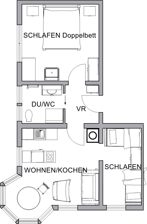 2 getrennte Schlafzimmer, 1 Doppelbett, 2 Einzelbetten, eine kleine Küche